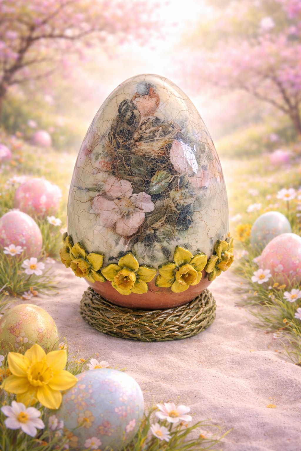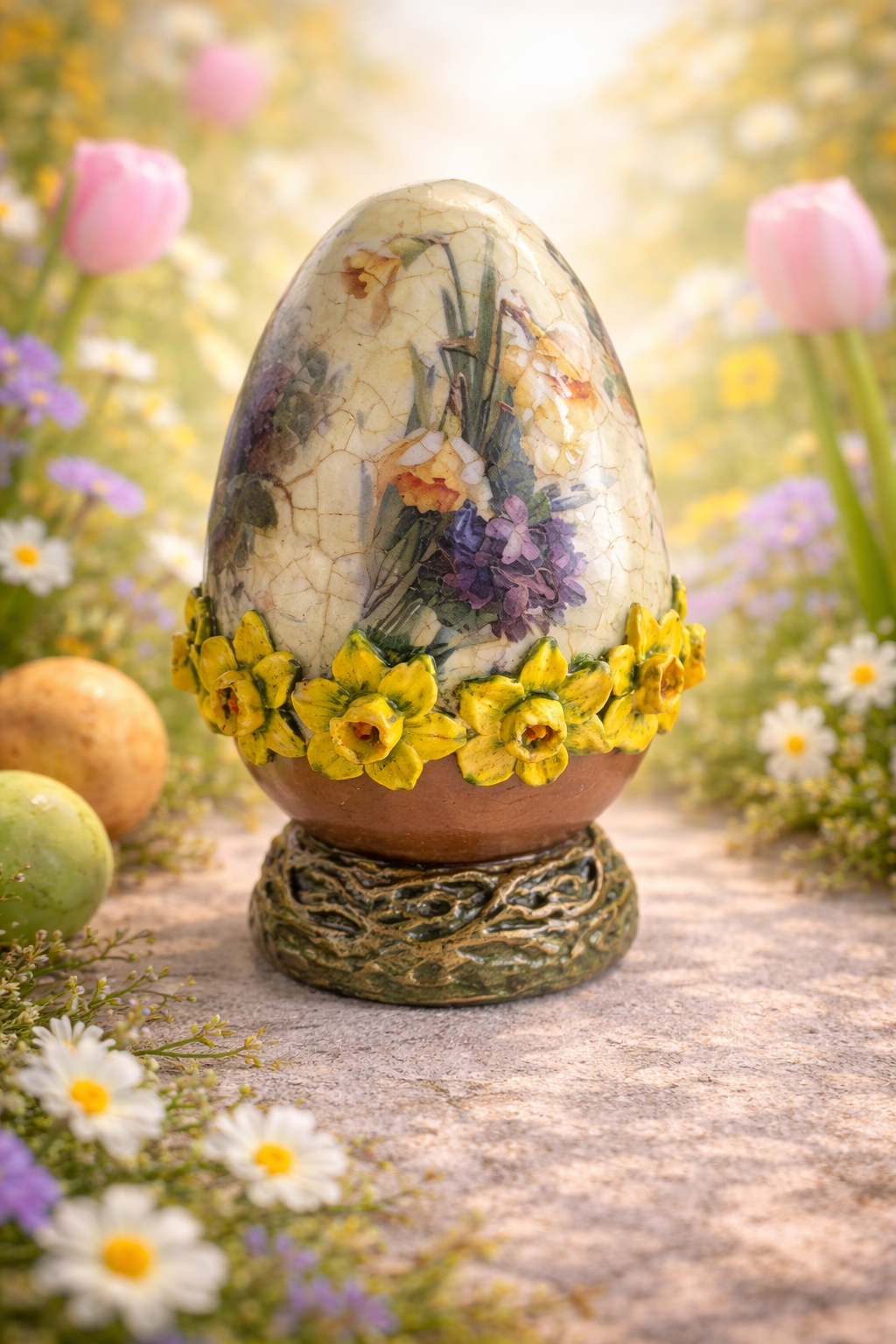 Urocza pisanka z narcyzami w koszyczku może być piękną ozdobą świątecznego stołu lub nietuzinkowym elementem wystroju wnętrza. Pisanka utrzymana w kolorach beżu, zieleni i miedzianego złota.