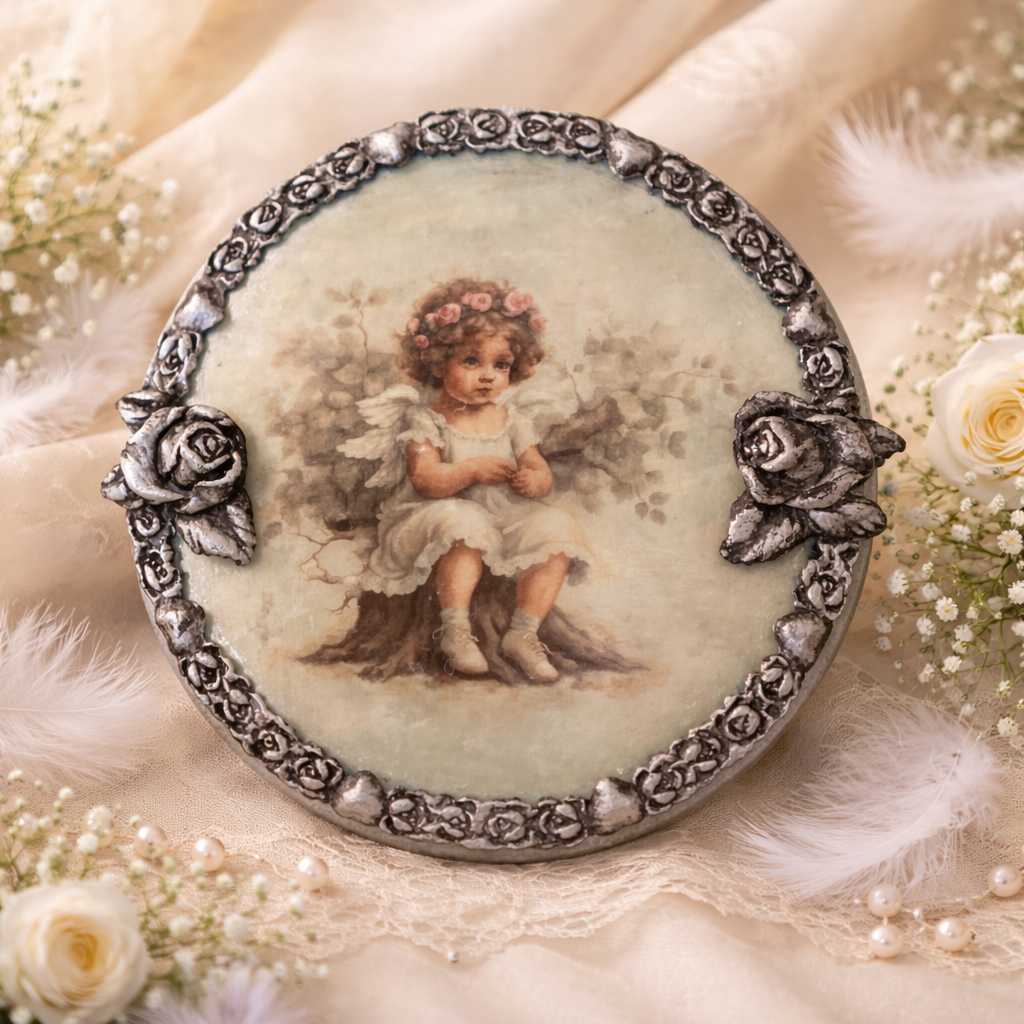 Panel wiszący z aniołkiem może być wspaniałą pamiątką na urodziny dziecka, a także dopełnieniem prezentu na Komunię św. Utrzymany w tonacji beżu i srebra.