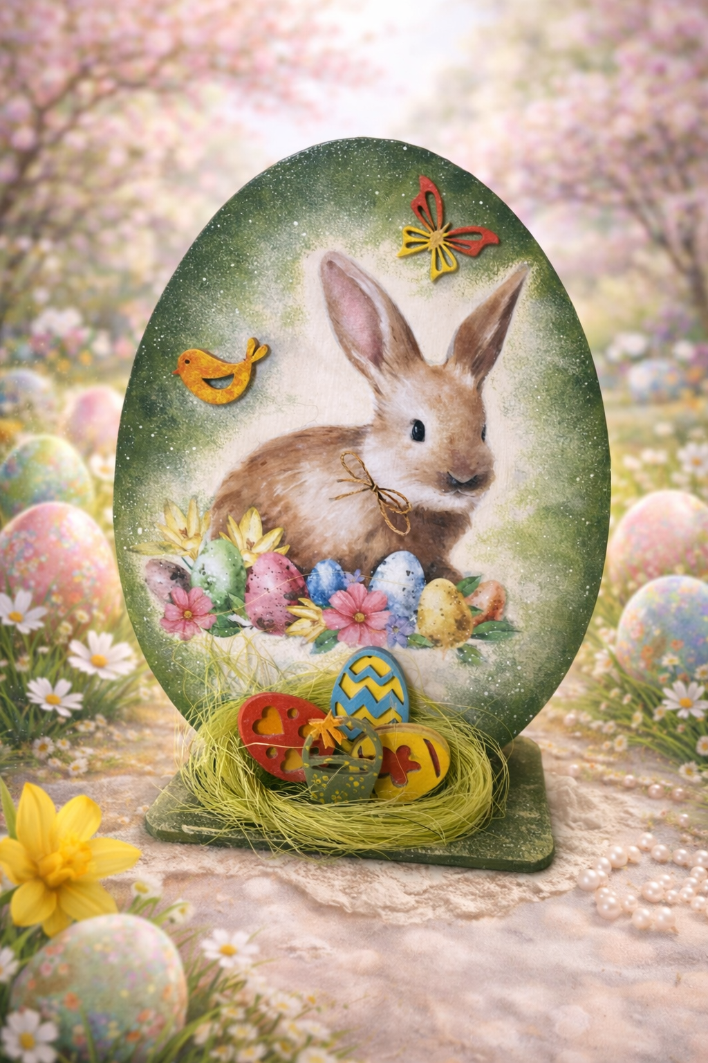 Panel wielkanocny z zajączkiem będzie pięknym elementem wielkanocnego  wystroju wnętrza. panel utrzymany w kolorach beżu i zieleni.