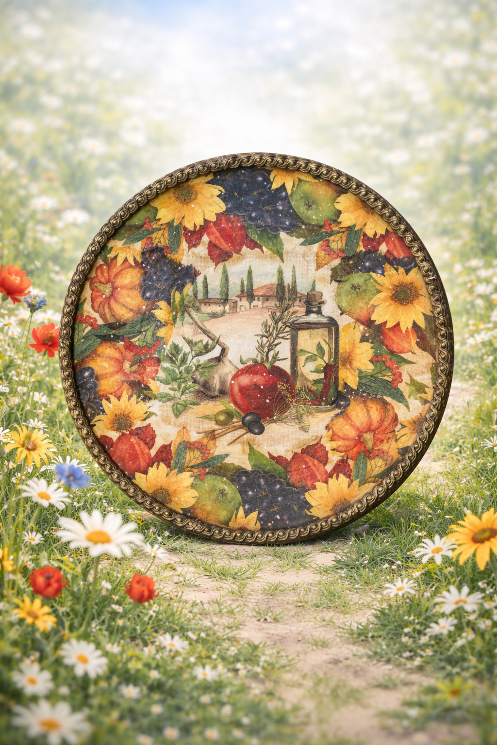Drewniana taca na owoce lub cisto, idealna na spotkania przy grillu lub towarzyskie pogawędki na łonie przyrody. Kolorystyka żywa w odcieniach żółci, pamarańczu, czerwieni, tył tacy i obramowanie metaliczny zielony.