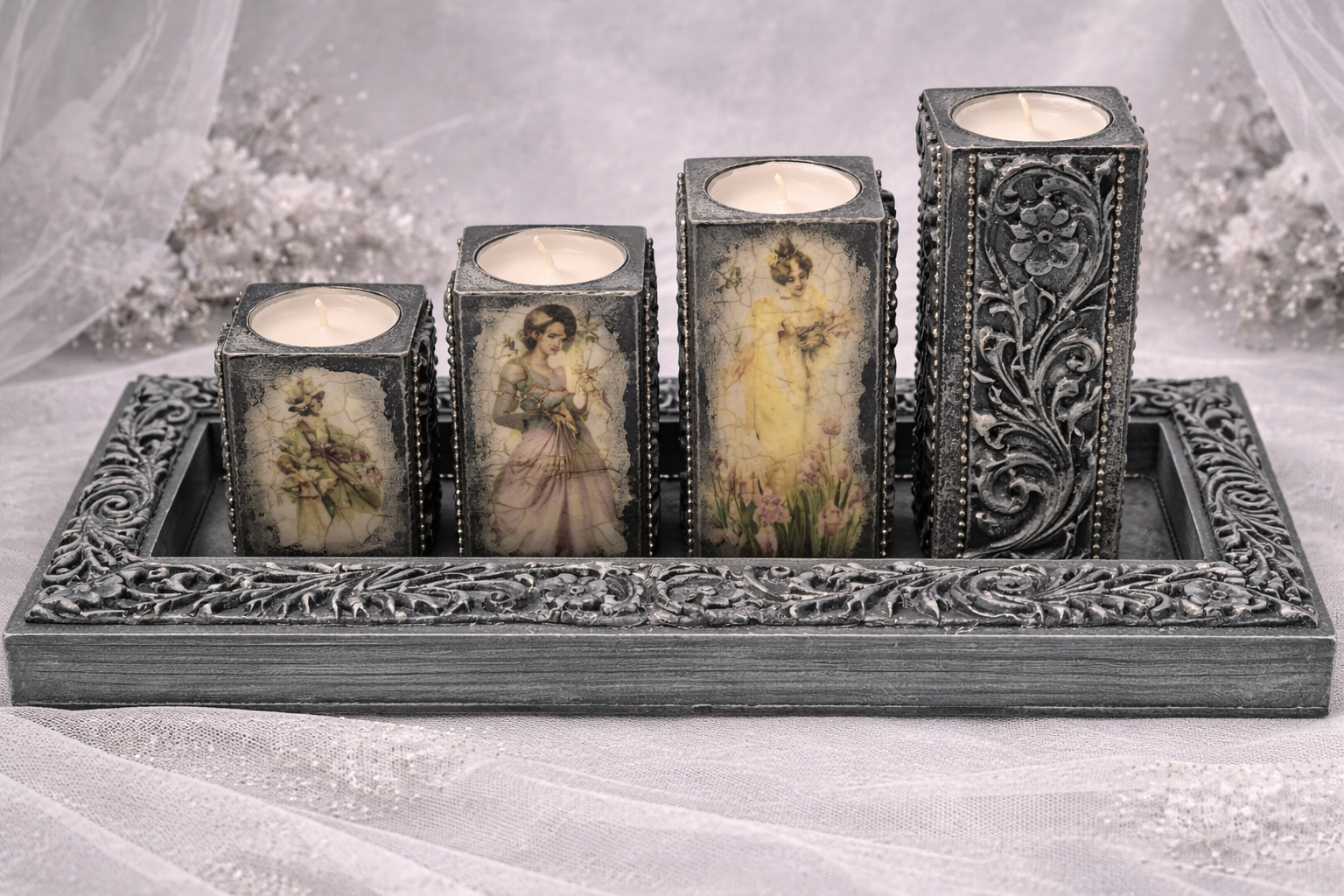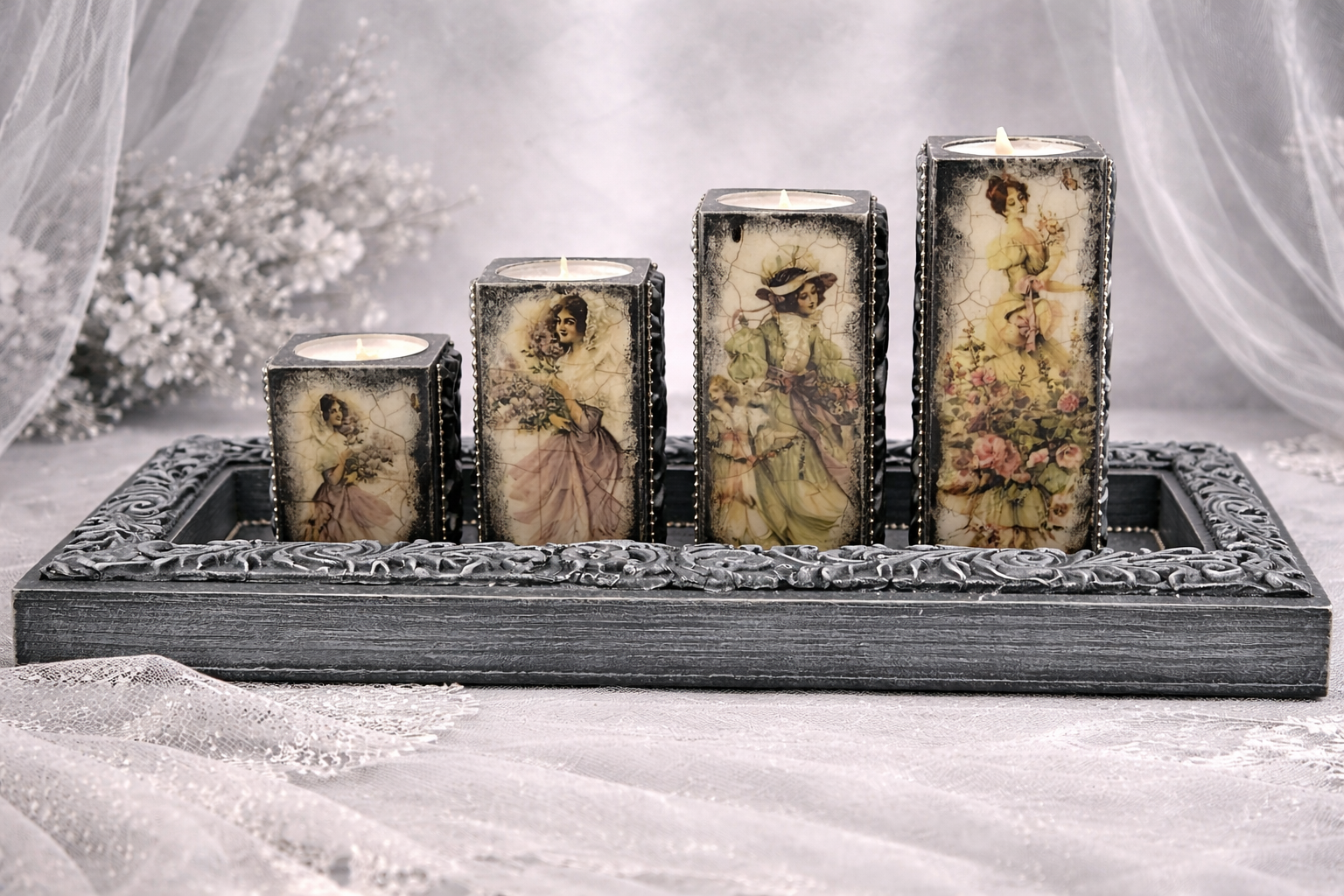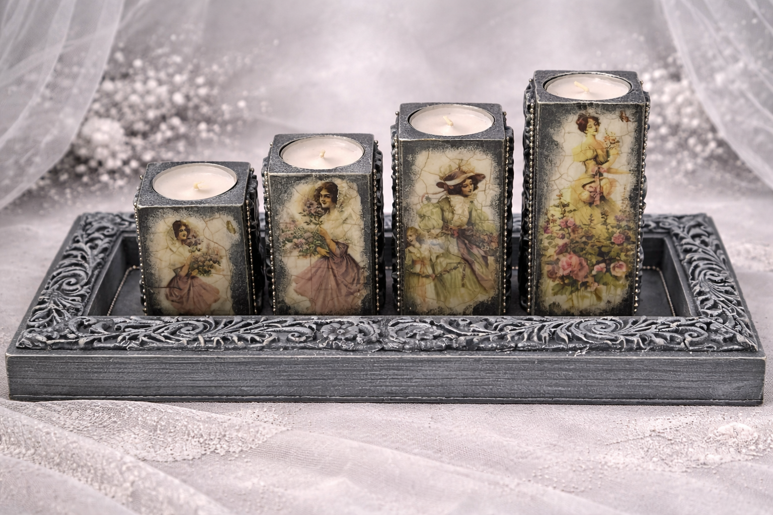 Zestaw czterech drewnianych świeczników w stylu vintage na świeczki typu light. Świeczniki na podstwawce utrzymane w kolorach szarości, czerni i srebra, mają kilka możliwości aranżacji. Po dwóch stronach różne ilustracje przedstawiające kobiety z XIX wieku, dwie kolejne to ornament. Świeczniki świetnie skomponują się zarówno na ławie jak i regale, dodadzą pomieszczeniu nietuzinkowego uroku.