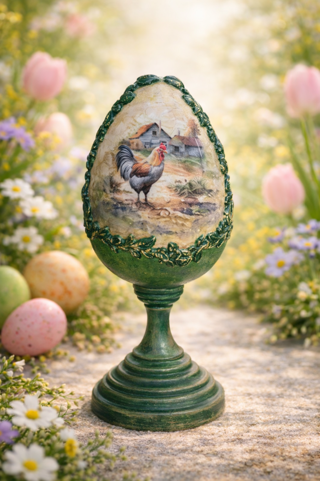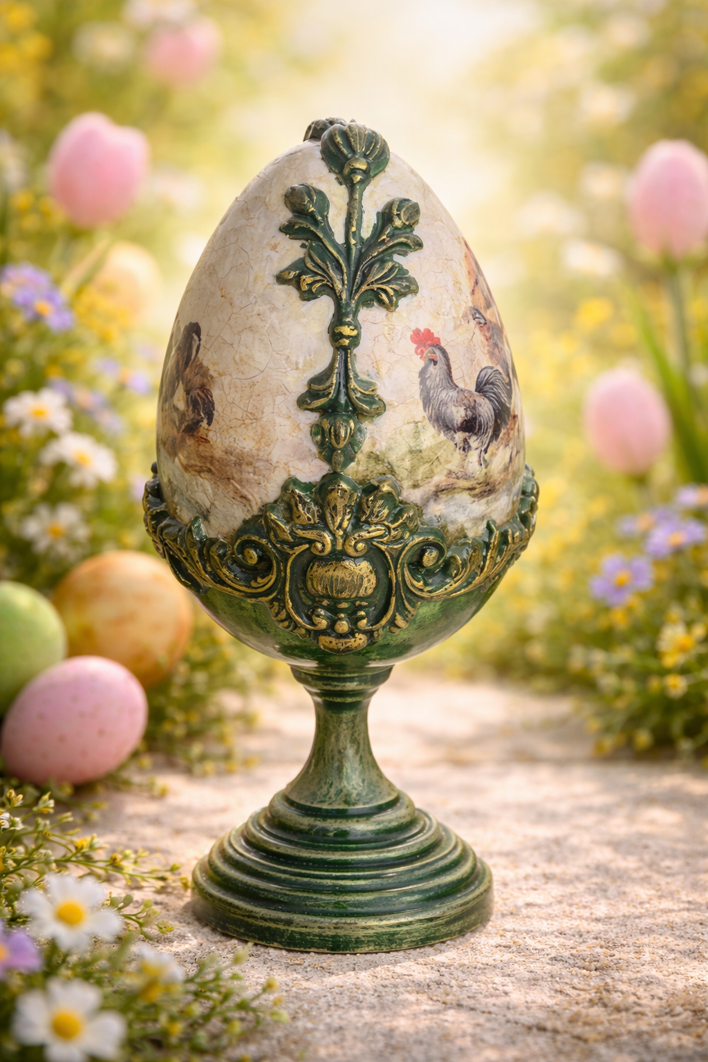 Urocza pisanka z kogutkami na nóżce może być piękną ozdobą świątecznego stołu lub nietuzinkowym elementem świątecznego wystroju. Pisanka utrzymana w kolorach brązu, zieleni i starego złota.