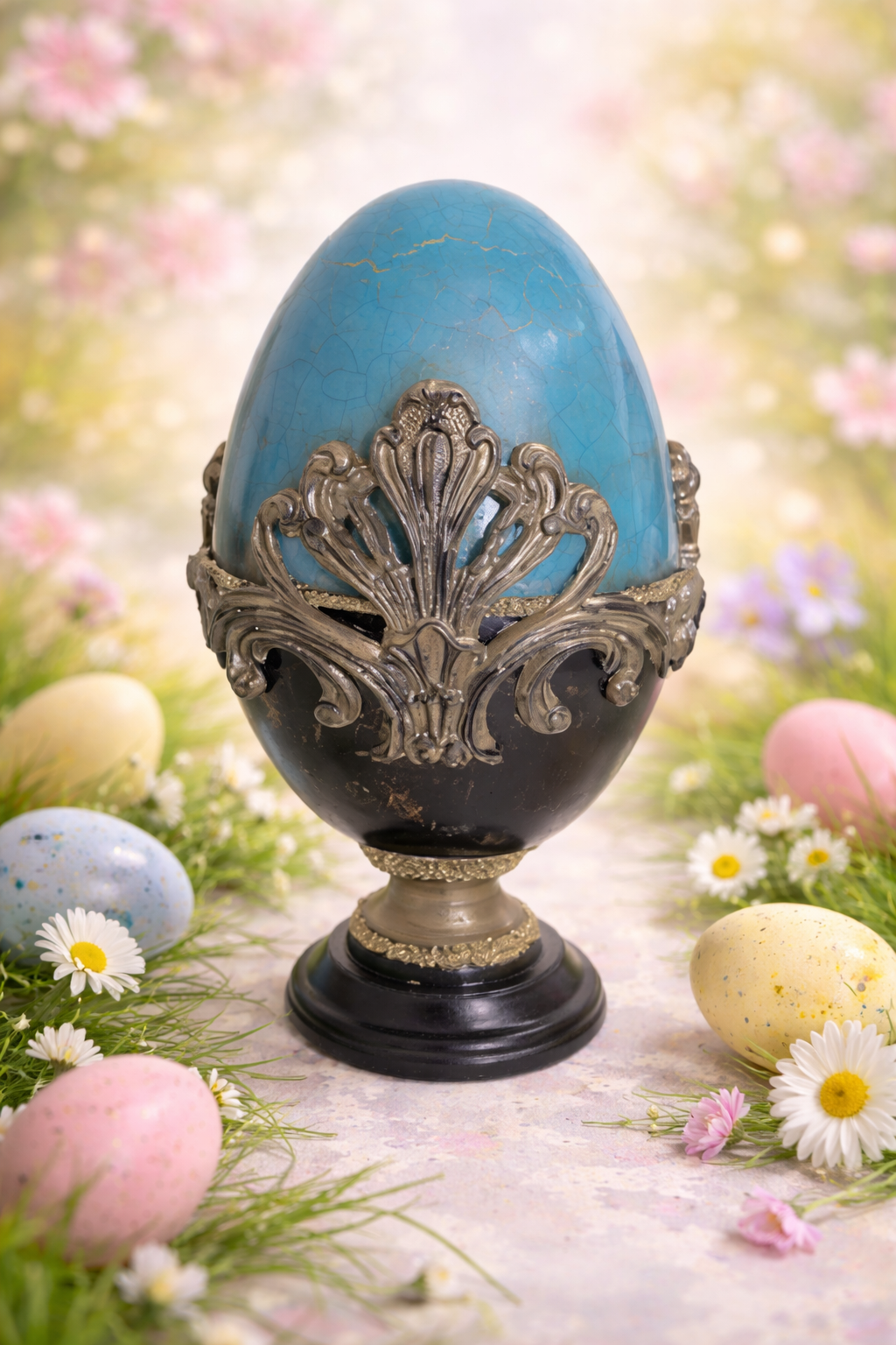 Duża pisanka w odcieniach ciemnego turkusu, czerni i starego złota  może być piękną ozdobą świątecznego stołu lub nietuzinkowym elementem wystroju wnętrza. Góra pisanki z drobniutkimi spękaniami brązowo-złotymi, dół czerń z refleksami złotymi. Nóżka pisanki ozdobiona drobniutkimi kuleczkami w odcieniu starego złota, nadającymi całości niepowtarzalnego dopełnienia.