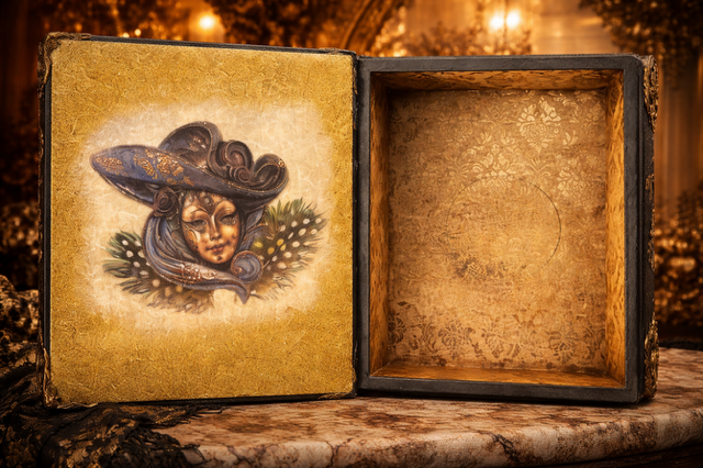 Głęboka ciemna zieleń przywodzi na myśl spokój i mądrość natury, a odcienie brudnego złota dodają jej szlachetności i ponadczasowej elegancji. Wenecka maska – symbol sekretów, przemiany i ukrytego piękna, zachęca do zajrzenia w głąb szkatułki. To zaproszenie do świata, który istnieje tylko dla wtajemniczonych. Świata Twoich tajemnic.